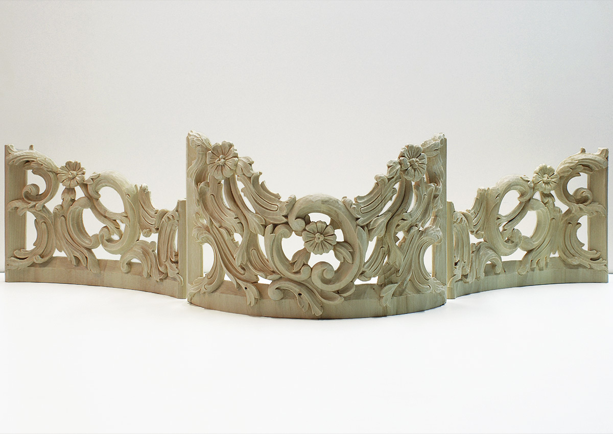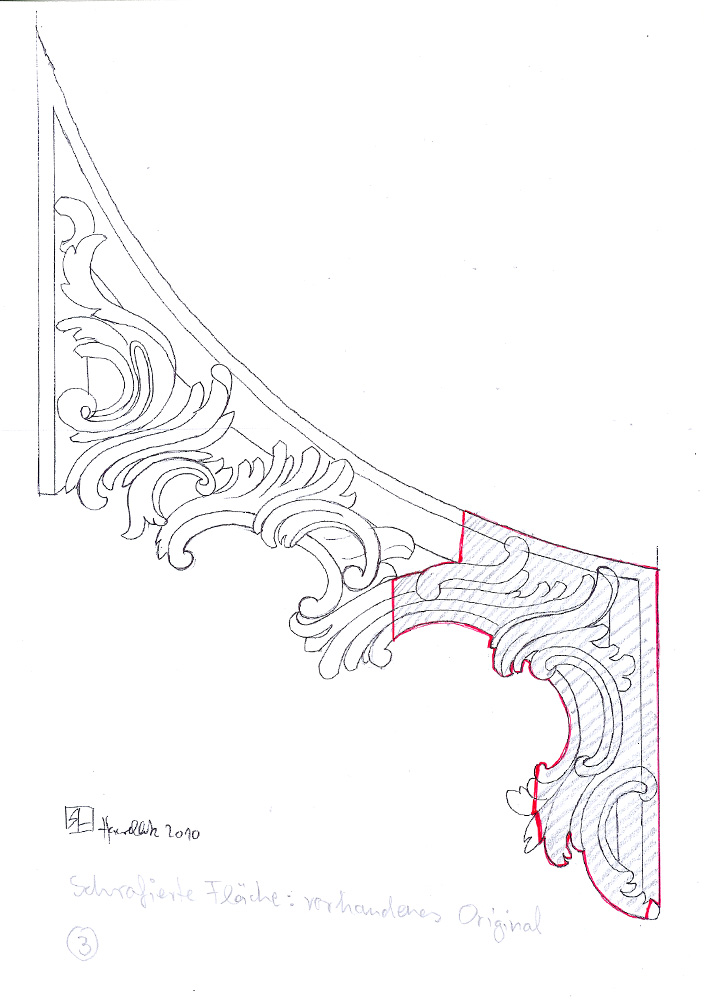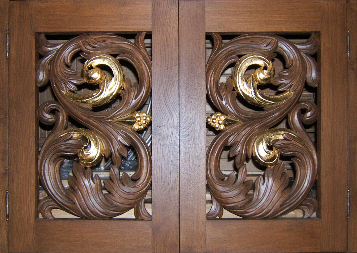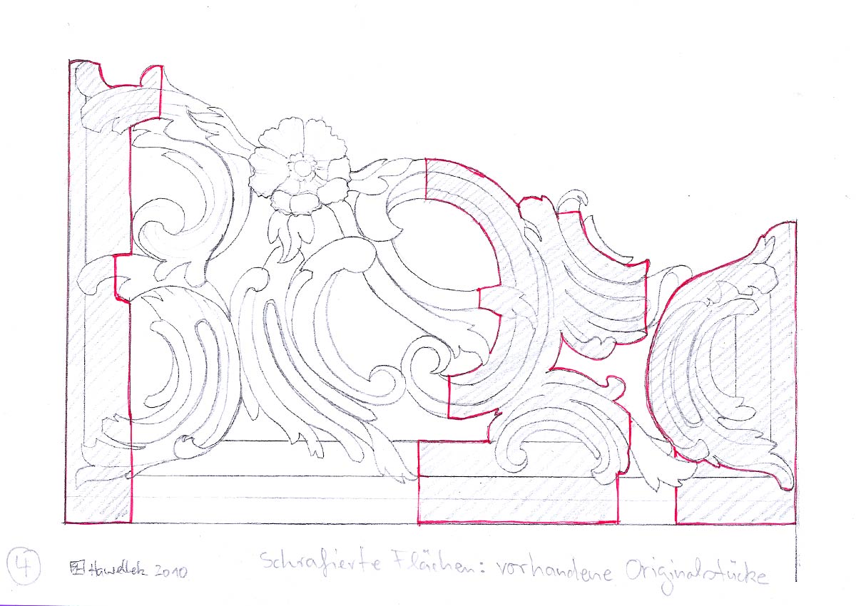 Für die Gerhard-von-Holy-Orgel in Canum wurden nach einem alten Foto die Schnitzereien rechts und links vom Mittelturm wiederhergestellt. Wegen der Erweiterung der Orgel galt es außerdem das Schleierwerk der Brustwerkstüren im Stil der historischen Schnitzereien neu zu gestalten.