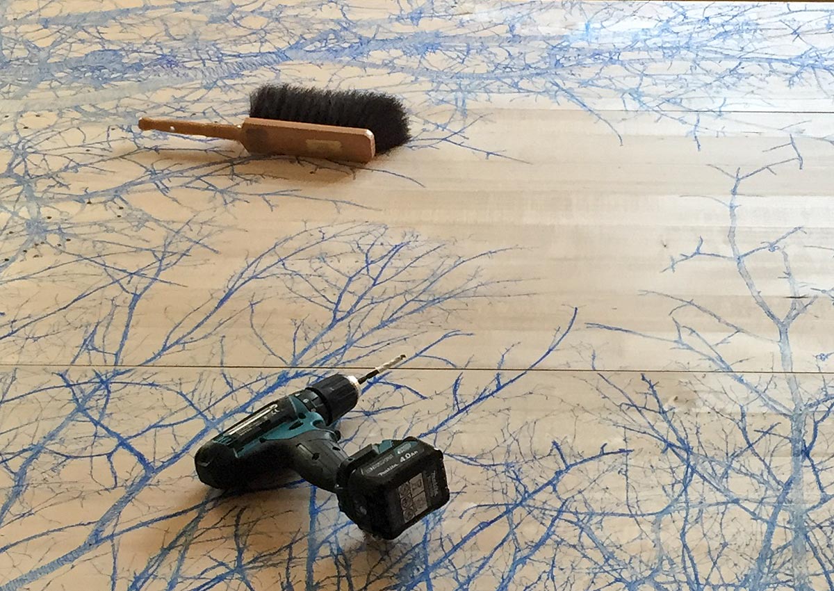 Mit Kettensäge und Schnitzeisen wurde die Zeichnung in Massivholztafeln aus Lindenholz geschnitten und in einem tiefen Blauton gefasst.