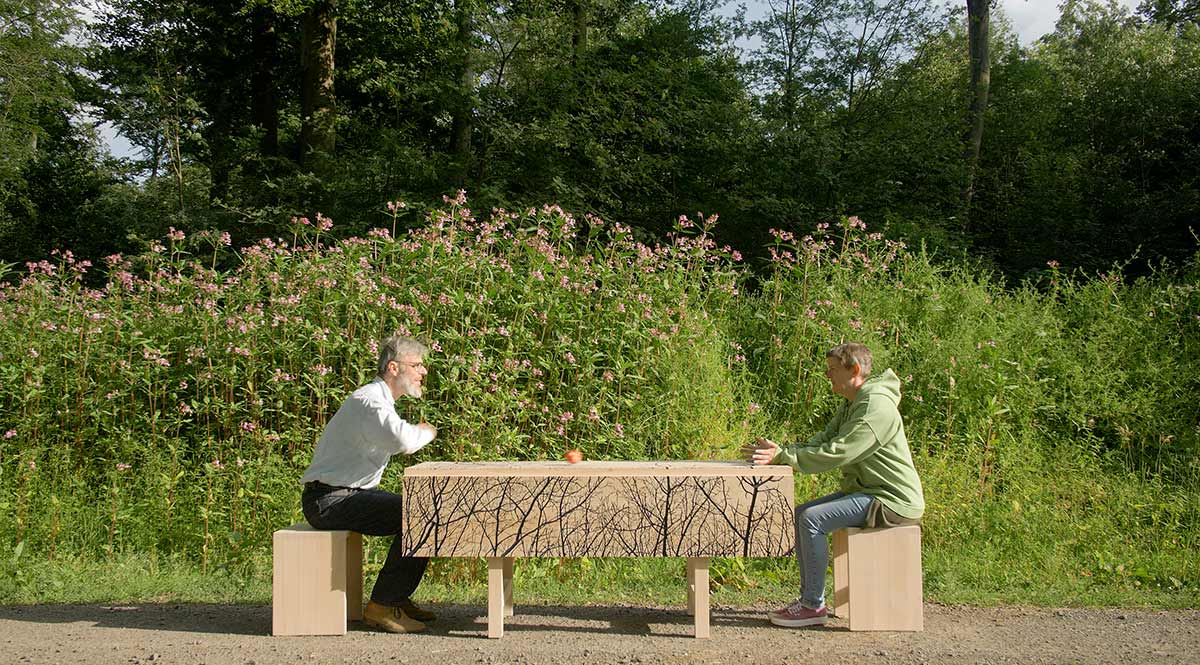 „Der Wald ist das neue Kaffeehaus!“ Dieser Satz gefiel mir. Als kurze Zeit später im Radio die Nachricht kam, dass Parkplätze an beliebten Ausflugszielen wegen Überfüllung geschlossen wurden, entstand die Idee, einen Tisch zu gestalten, an dem sich zwei Menschen im Abstand von mehr als 1,5 Metern gegenüber sitzen.