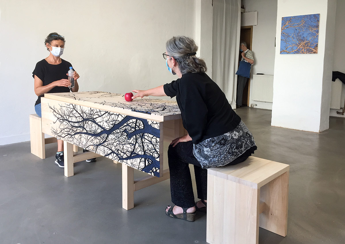 In der Kunstausstellung „Déjeuner sous arbres“ möchte ich an diesem Tisch mit Menschen ins Gespräch kommen oder anderen die Möglichkeit dazu bieten.